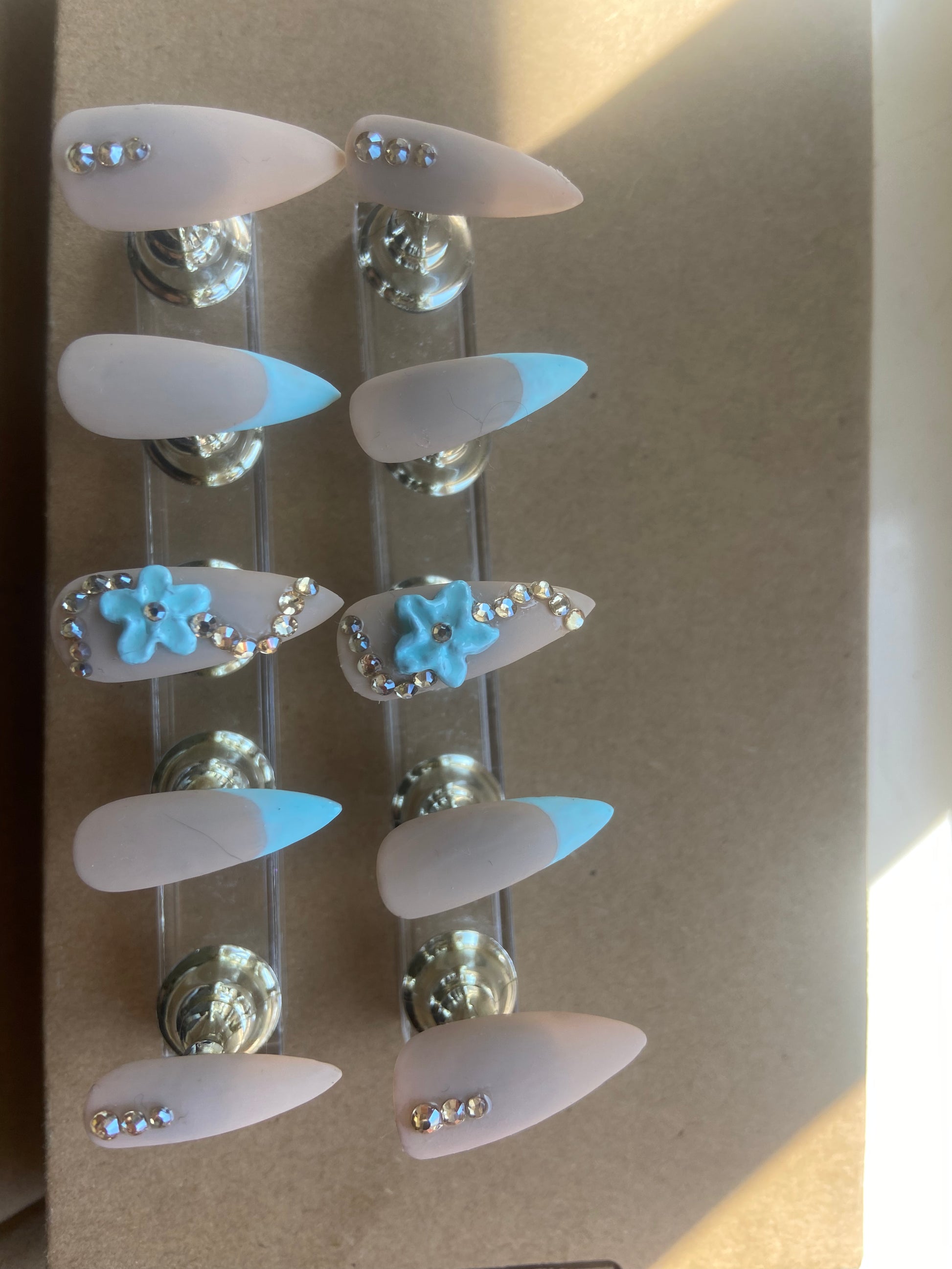 Soft teal blue and nude colour nails with a matte finish. 3D flowers with rhinestone accents.