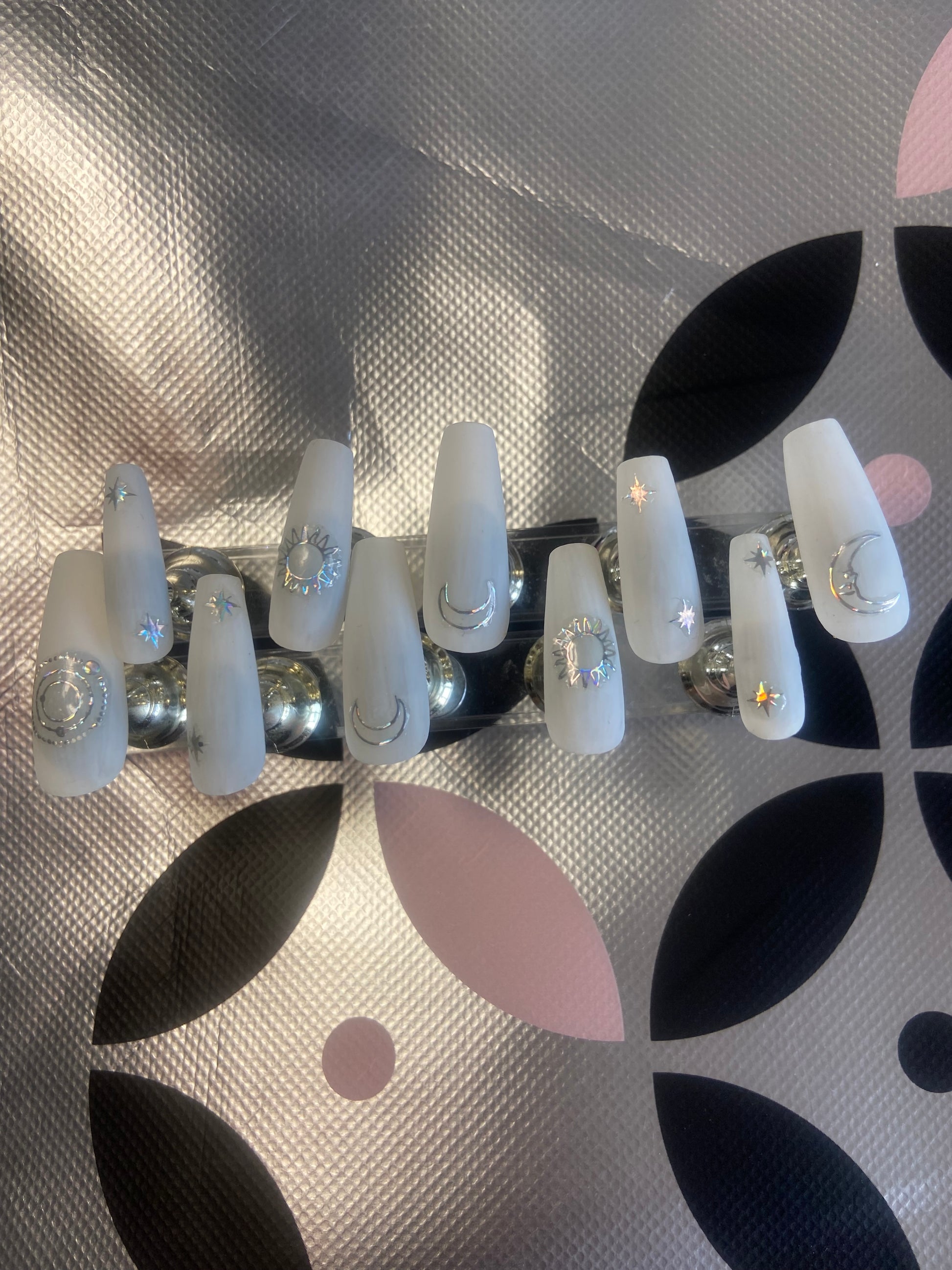 Matte milky white Ballerina nails inspired by the Lunar phases.